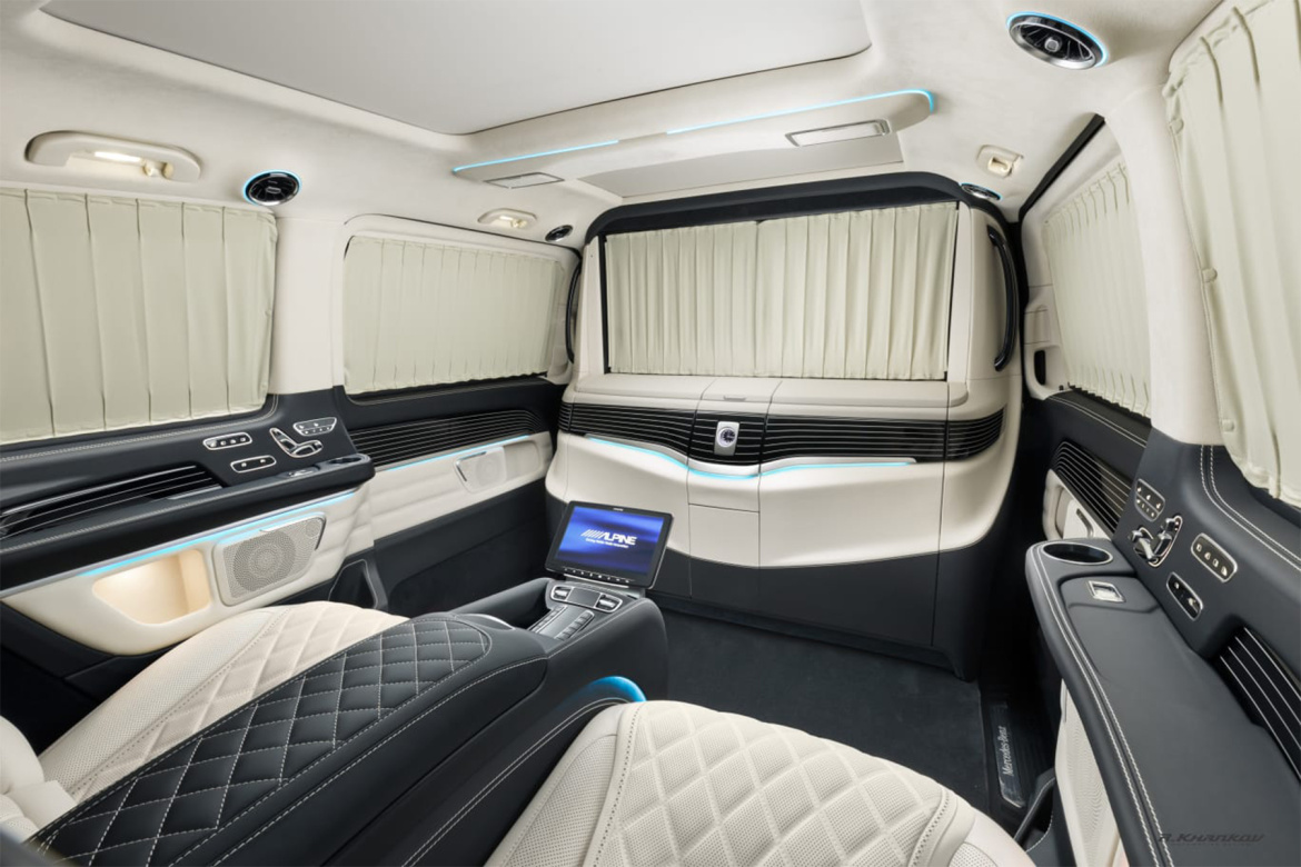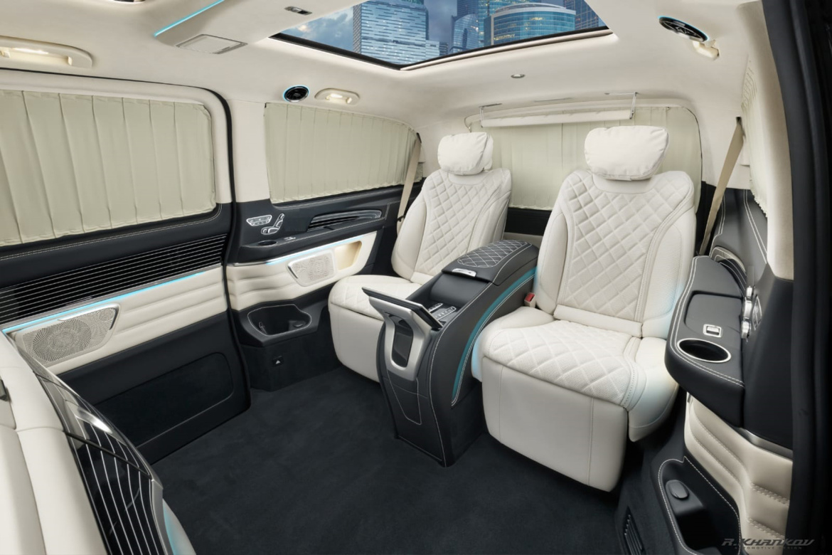• Отделка натуральной кожей и шпоном дерева задней части салона. Возможны различные цветовые решения • Штатный пластик окрашивается в цвет кожи • Полная шумоизоляция салона автомобиля несколькими слоями шумоизоляционных материалов • Подушки из алькантары на подголовники задних кресел • Подушка Mercedes-Maybach в салон • Электроподножка второго кресла • Сейф на электроприводе в нижней части перегородки • Холодильник на электроприводе в центральной консоли |